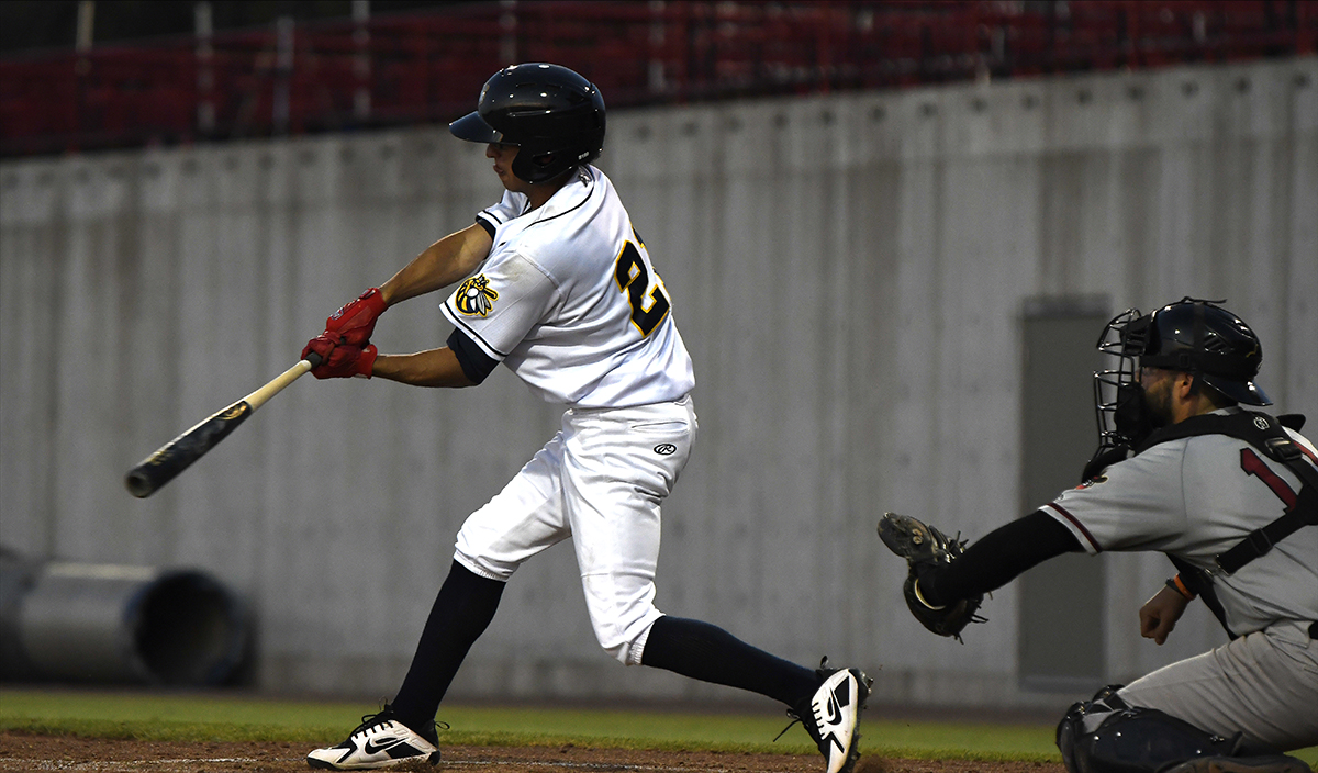 Photo: Rayneldy Rosario hits a two-run double in the sixth inning. (Steve Cirinna/Burlington Bees)