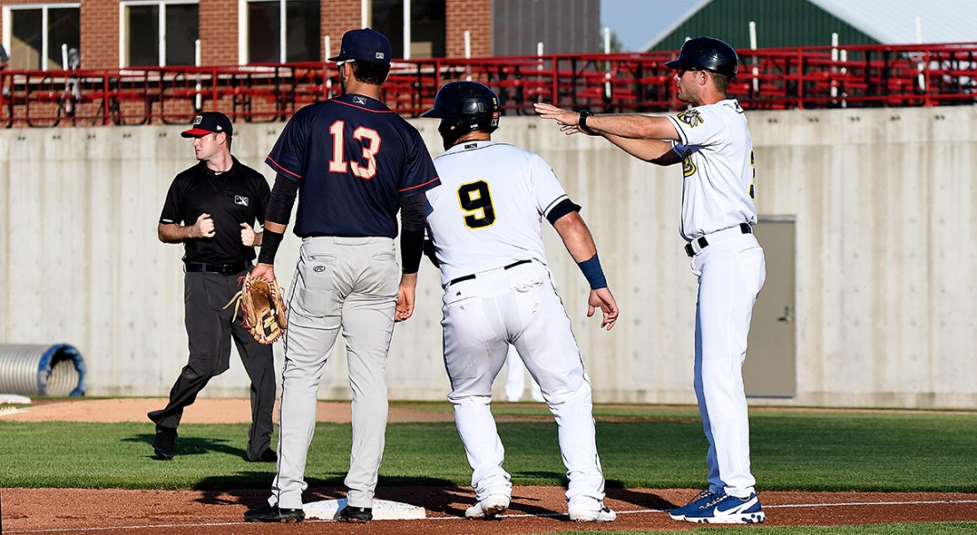 Photo: Trevor Nyp (right) signals to stop Harrison Wenson at third base during a recent game. (Steve Cirinna/Burlington Bees)