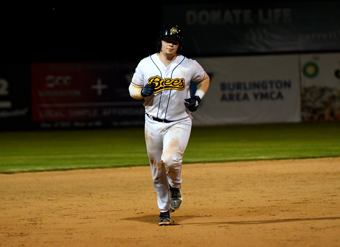 Photo: Zane Zielinski (right) greets Jackson Jones after his two-run home run in the fifth inning. (Steve Cirinna/Burlington Bees)