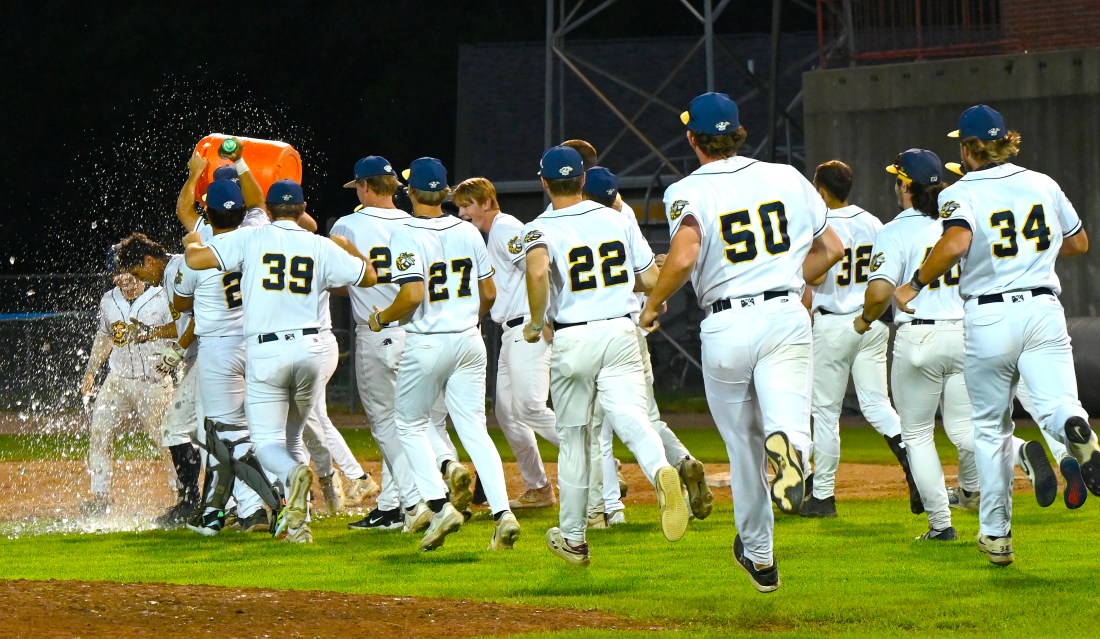 Photo: Burlington Bees left fielder Jace Figuereo is doused with water after getting hit by a pitch to force in the winning run in Thursday’s game. (Steve Cirinna/Burlington Bees)